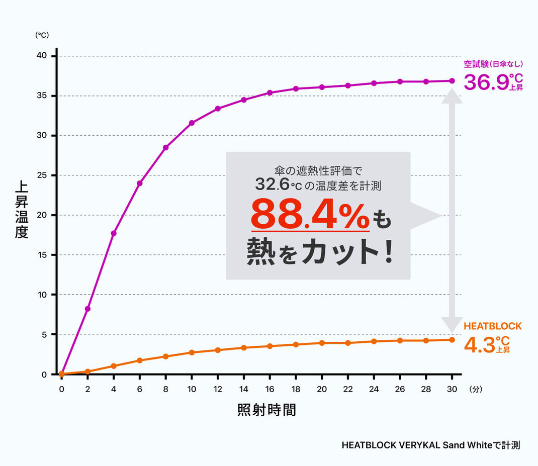 高い遮熱率で涼しさをキープ: 薄くて軽い生地でありながら、太陽光の熱を効果的に遮断し、傘の内側の温度上昇を大幅に抑制します。実際に傘製品そのものを用いた「傘の遮熱性評価試験」では、HEATBLOCK®生地を使用した傘(Sand