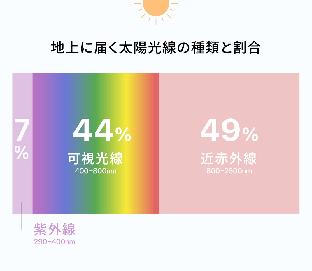 太陽光線の中で、肌に影響を与えるとされるもののうち、紫外線が占める割合はわずか約7%と言われています。残りの約93%は可視光線と近赤外線です。これまでの日傘は紫外線対策が主でしたが、近年の研究では可視光線や近赤外線もシミ、くすみ、肌老化の原因となることが指摘されています。
