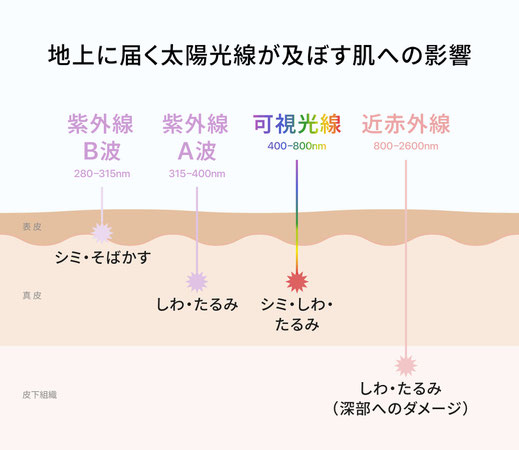 - 波長が短く、主に肌の表面「表皮」に強く作用します。屋外での日焼けの主な原因で、肌が赤くなる炎症(サンバーン)や、メラニンを増加させてシミやそばかす、肌の乾燥を引き起こします。エネルギーが強いため、皮膚がんのリスクも高めます。夏に特に量が多くなります。